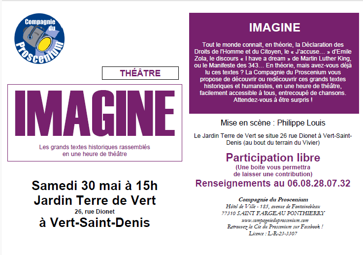 Le 30 mai à 15h, le Jardin accueillera la Compagnie du Proscenium qui donnera la pièce « Imagine », mise en scène par Philippe LOUIS.